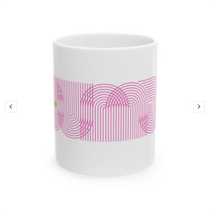 Loading image: Pink bandana with white geometric pattern and text on a pink background