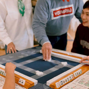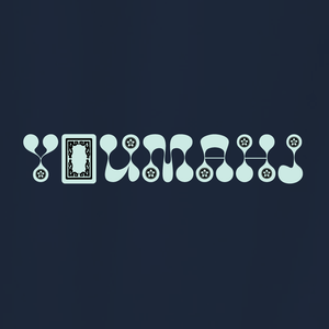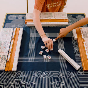 Loading image: Navy blue scarf with white geometric pattern and 'YOUMAHJ' text
