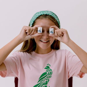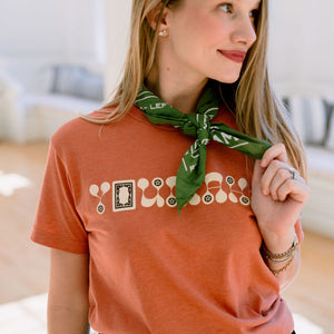Loading image: Green bandana with white geometric pattern and 'Youman' branding
