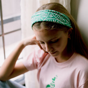 Loading image: Green bandana with white geometric pattern and 'Youman' branding